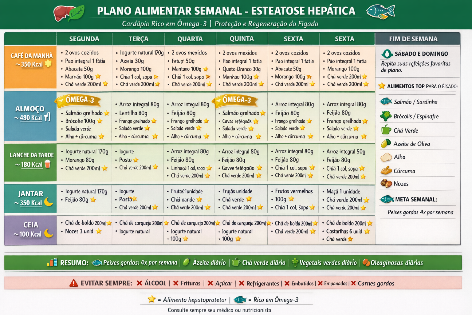 Cardápios prontos e saborosos para todas as refeições — café da manhã, almoço, jantar e lanches. Feitos por nutricionista especializada e pensados especificamente para quem tem gordura no fígado. É só seguir.