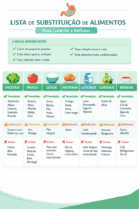 Com essa lista prática, você pode adaptar suas refeições com o que já tem em casa, mantendo o estômago calmo. Cada substituição foi pensada por nutricionista para que você nunca precise “sair do plano” quando faltar algum ingrediente.